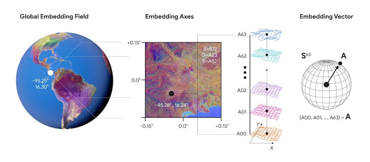 Or you could use it to map everything like google’s AlphaEarth Foundation model which compresses petabytes of satellite data (optical imagery, radar, climate models, topography, gravity measurements) into 64-dimensional embeddings for every 10-meter square of Earth’s terrestrial surface.