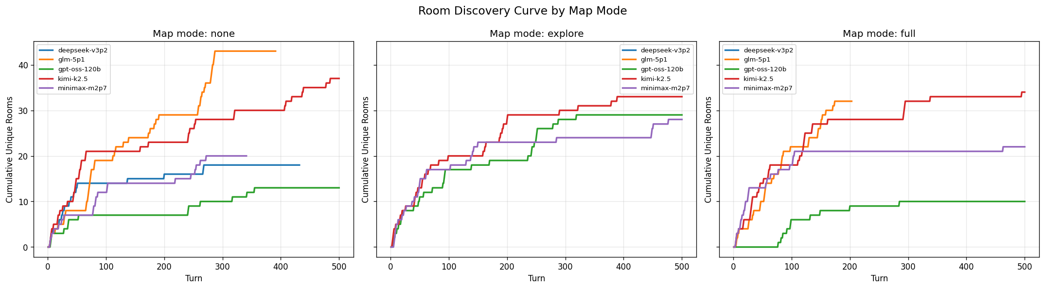Another component is what tools are helpful or harmful to LLM problem solving. In the below plot we can see what happens when LLMs are given no tools, the ability to make a map as they travel, and starting with a full map which was a common way for people to play the game when it came out. Below you can see that naavigating rooms, kimi-k2.5 is the only LLM that consistently performs the same no matter what tool they use. With no tools glm does rather well. It seems like when LLMs are able to create a map as they explore, they all do similiarly (middle plot) in exploring rooms. And when they are aware of the entire map there is a wide disparity. I think this is because of the token usage when you have to load in the entire map into the context window.