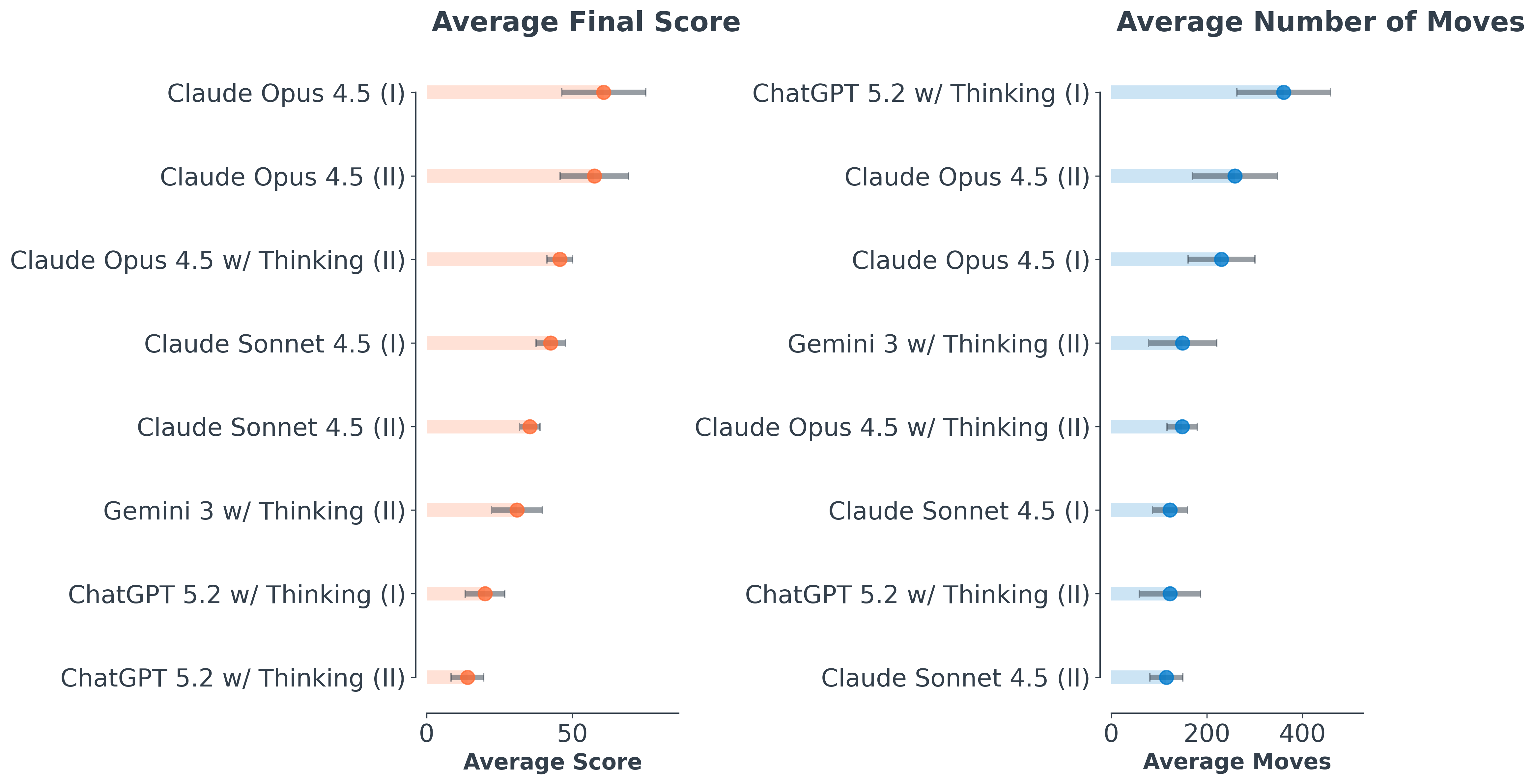 The goal of Zork is to go into the dungeon and solve puzzles to find treasures. Treasures can then be deposited in the treasure case. And you get points both for finding treasures and putting them in the case. You also get points for going to hard to reach locations and solving puzzles. You need to be able to manage your inventory to do this (you can’t carry everything at once because it would be too heavy), there are puzzles to solve like figuring out the loud room or how to turn yourself back into a human if you become a ghost, an underground maze, and other things that present real problem solving challenges for a person or an LLM trying to play this game. And it seems like LLMs actually suck at this. Below you can see a plot from the paper, Playing With AI: How Do State-Of-The-Art Large Language Models Perform in the 1977 Text-Based Adventure Game Zork?, which shows that modern LLMs barely get any points at all, with an average across all of them sitting around 50 points out of 350. And they take quite a lot of moves to do nothing at all.