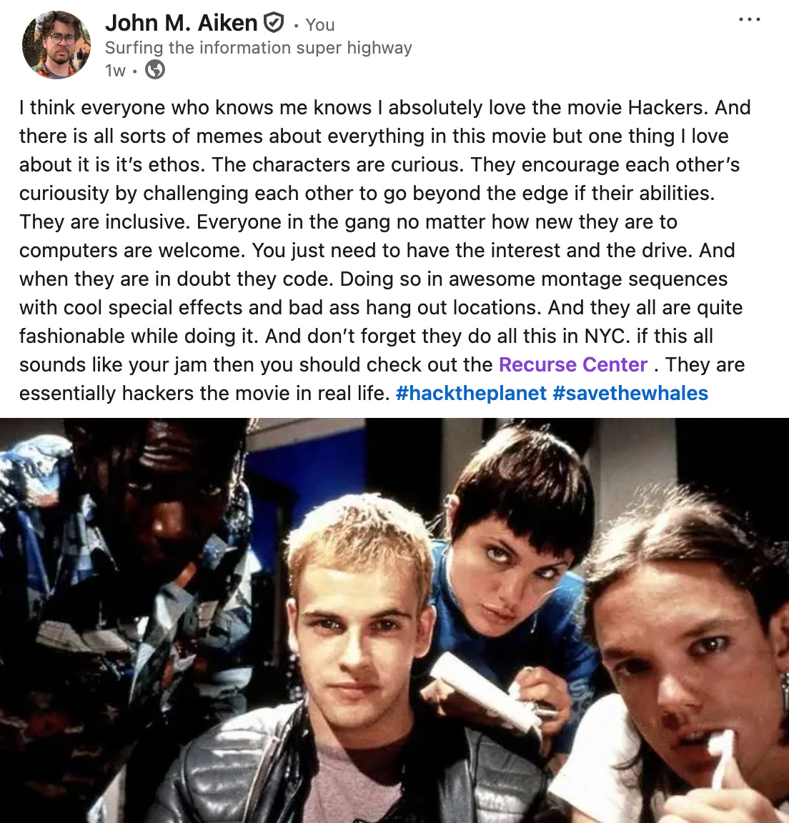 I attended a Recurse Center batch recently. Recurse Center is a programming retreat where technically minded people congregate to build cool stuff. I think I better summed it up on LinkedIn where I said that it is basically Hackers, the movie, but in real life: