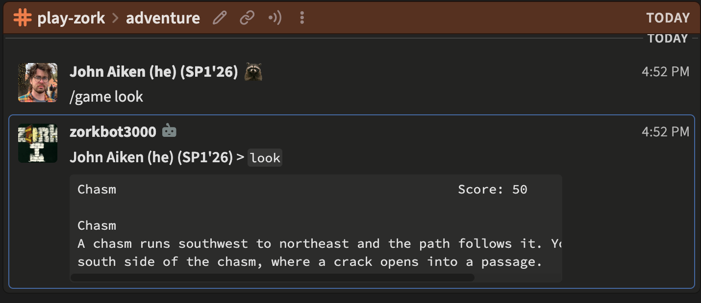 The first thing this led to was the creation of zulip-zork, a zulip bot (zulip is a group chat program like slack or discord) that allows anyone within a zulip channel to play zork. Actually, I built this on the airplane traveling back from New York City to The Netherlands where I currently live. Missing my Zork friends at Recurse, I thought to myself, what is a Zork project I could do? Initially, I thought, well lets get LLMs to play Zork. But I decided that was too difficult at the moment, so then I decided what would be better than to continue playing Zork online? So, thank god the plane had free WiFi, I was able to hack together a zulip-zork bot built on top of Bot-Builder and docker-zork.