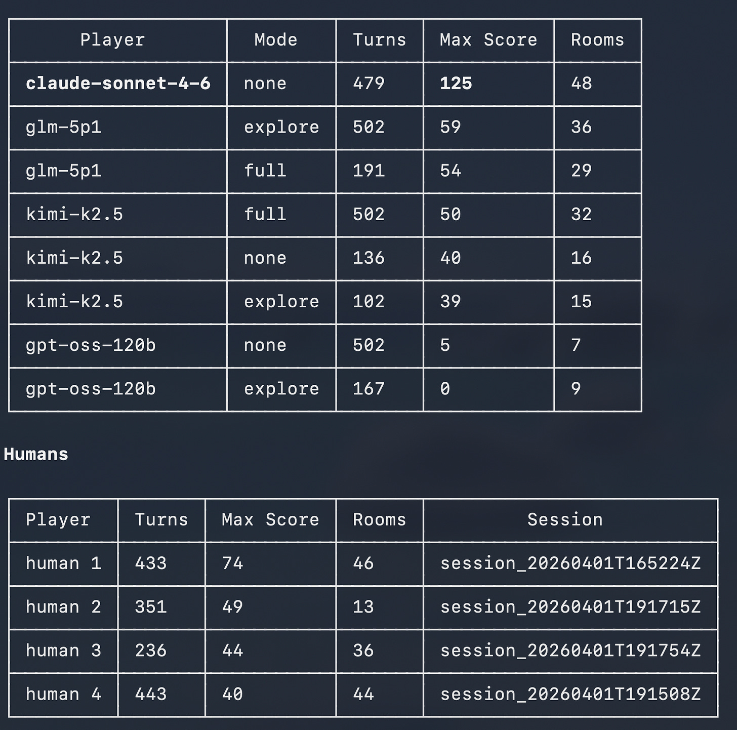I organized an hour long event at Recurse Center, promised delicious donuts to everyone who came, and had them setup zork-bench on their laptops and play in human-eval model. The game logs all of their interactions using the same interface as LLMs but gives them a random label. The thing is Humans new to the game seem to do only so well. They spend a lot of turns, play the game, and figure some stuff out, but then after the hour of playing I gave them, they didn’t get further than any LLM. However, theyir memories of the game persist without continuously reducing the size of their context windows. Haha. Do humans have context windows? But the point is that LLMs, having humanity’s entire knowledge of Zork stored in their memory banks, are unable to outperform humans who had not played Zork before (except for Claude Sonnet, which Isha Bhand, creator of fomo.nyc and Zork aficionado, declared as evidence that AGI has been achieved).